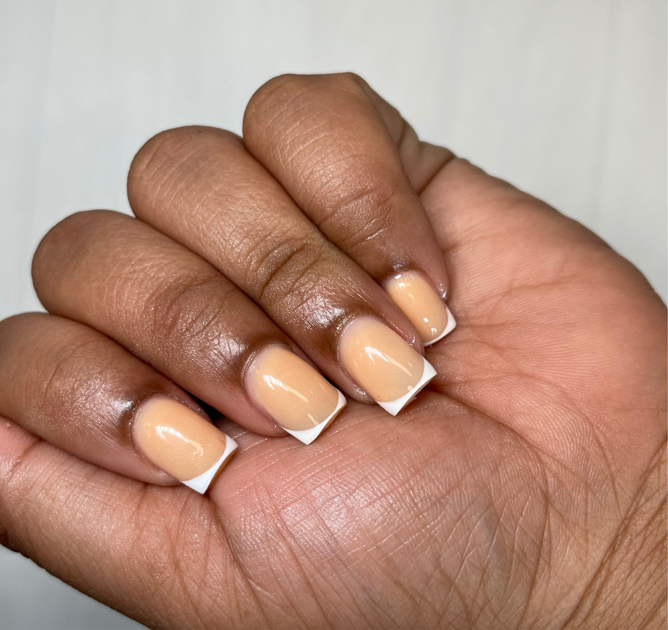 This acrylic has soft, creamy beige with a subtle sheen. It has a natural, neutral tone that gives off a polished appearance, complementing various skin tones.